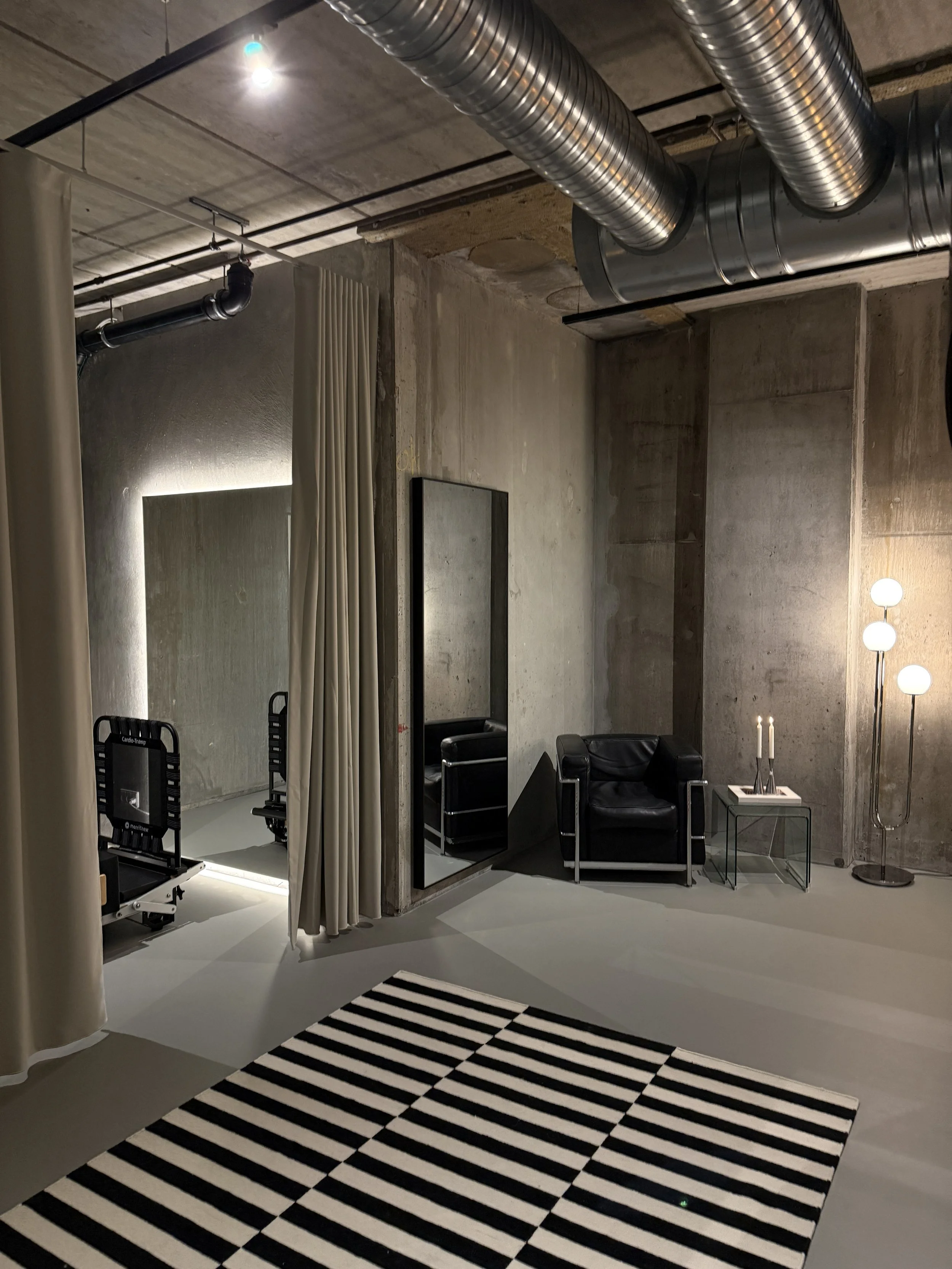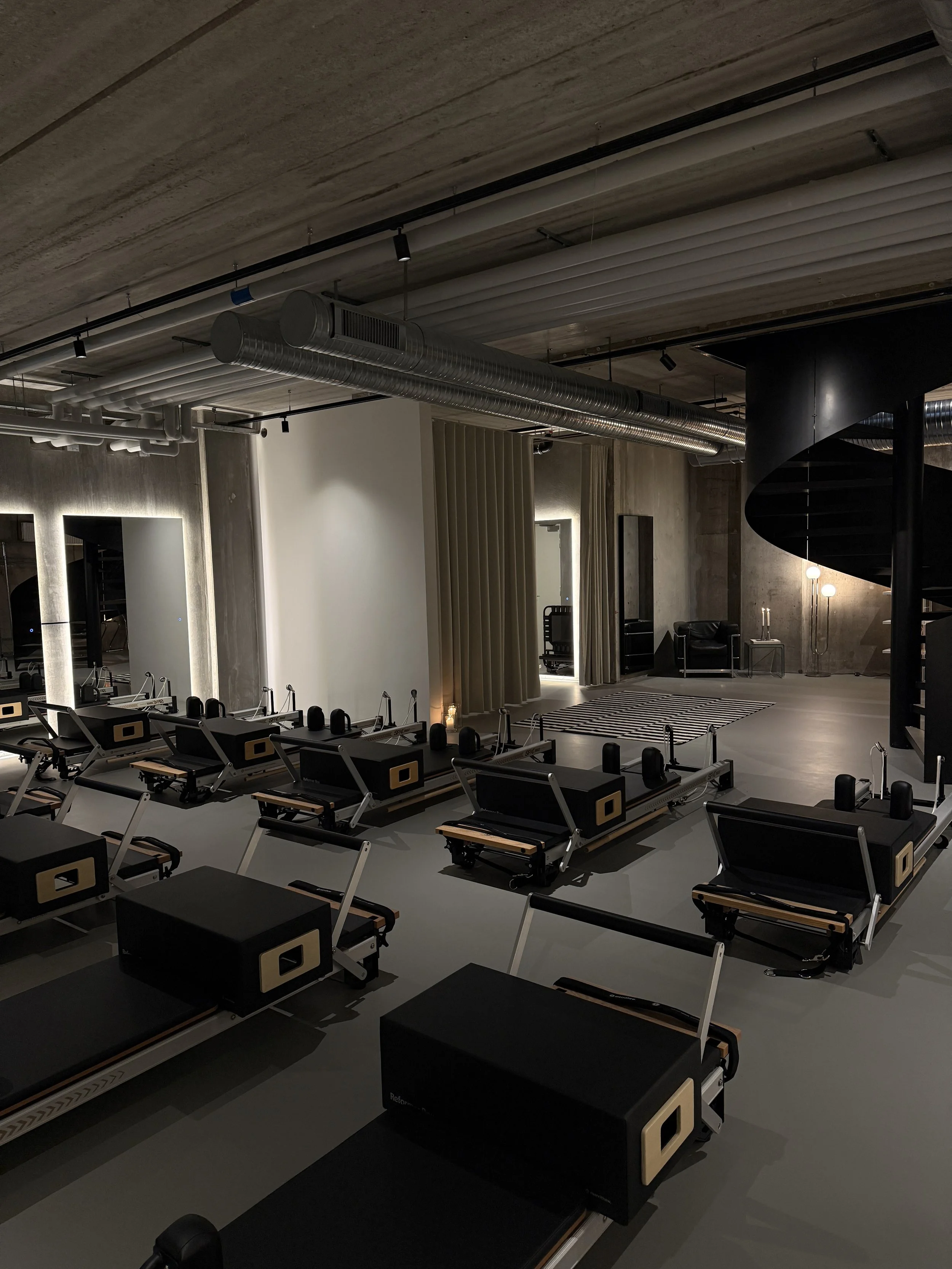 • Gym with Pilates reformer machines, exercise equipment, and a modern industrial design with exposed ductwork.